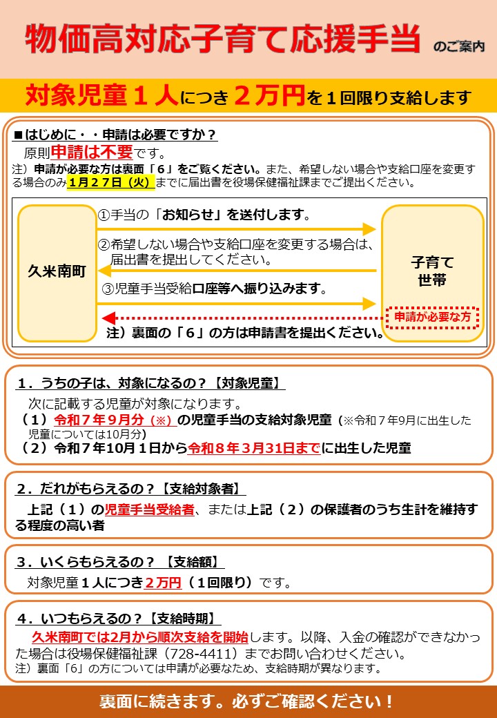 物価高の影響を強く受けている子育て世帯を支援するため、0歳から高校生年代までの児童1人につき2万円(1回限り)を支給する制度です。