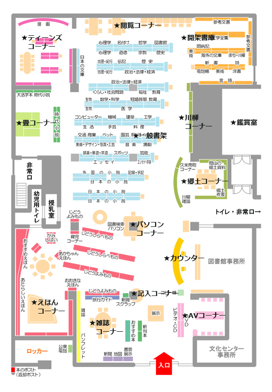 言語に関する本、文学全集、詩、俳句、海外小説の文庫、新書本、闘病記コーナー、岡山県の電話帳などを置いています。 |